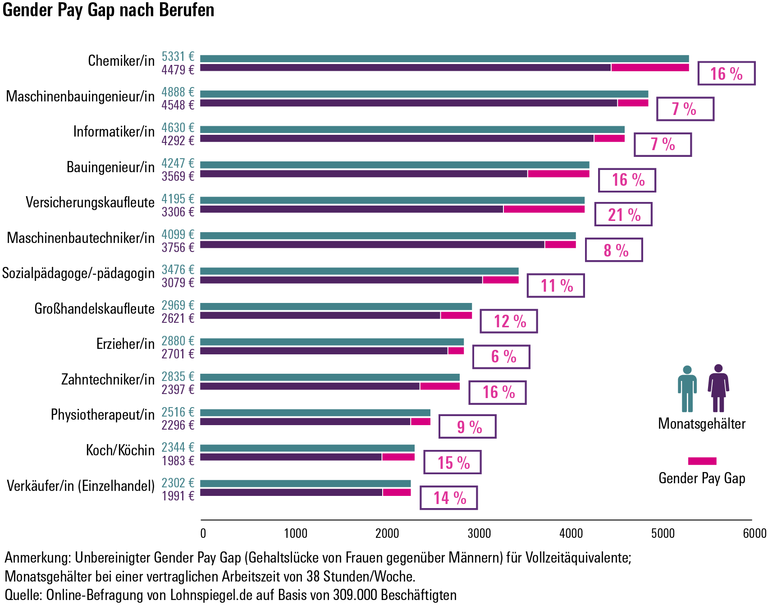 Die Gehaltslücke lässt sich sowohl mit Gehaltsabständen zwischen einzelnen Berufen als auch mit einer Gehaltslücke zu Lasten von Frauen innerhalb der einzelnen Berufe erklären. So arbeiten Frauen überdurchschnittlich häufig in vergleichsweise schlecht bezahlten Berufen, zum Beispiel als Verkäuferin im Einzelhandel (Durchschnittsgehalt der Frauen: 1.991 Euro, Frauenanteil unter den Befragten: 66 Prozent), als Physiotherapeutin (2.296 €, 67 Prozent Frauen) oder Erzieherin (2.701 €, 75 Prozent Frauen). „Bei den Löhnen hinken die sozialen Berufe, in denen Frauen deutlich überrepräsentiert sind, oft hinterher“, sagt Dr. Malte Lübker, Experte für Tarif- und Einkommensanalysen am Wirtschafts- und Sozialwissenschaftlichen Institut (WSI) der Hans-Böckler-Stiftung. „Dies gilt auch dann, wenn die Anforderungen an die Qualifikation vergleichbar sind.“ Höhere Löhne werden u.a. in den technischen Berufen bezahlt, wo der Männeranteil i.d.R. über 90 Prozent liegt.