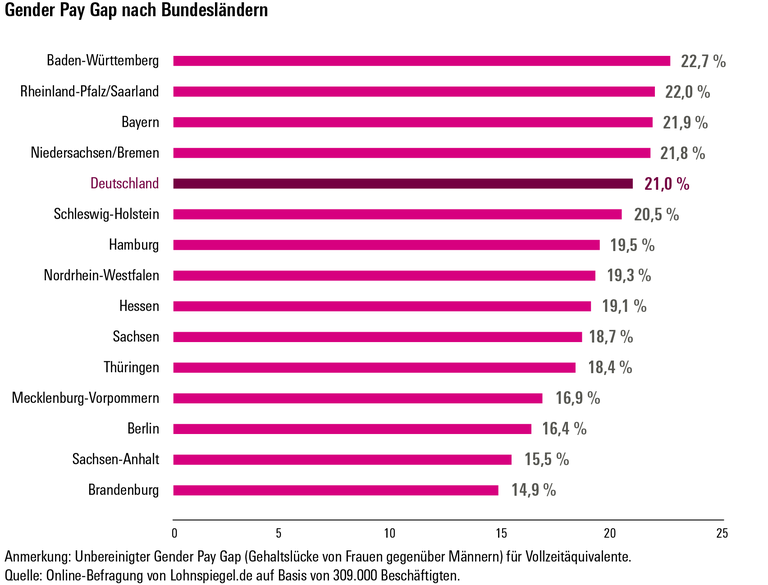Besonders groß ist der Gehaltsrückstand von Frauen gegenüber Männern in Süddeutschland, während die ostdeutschen Bundesländer auf deutlich geringere Entgeltunterschiede kommen. So verdienen Frauen in Baden-Württemberg durchschnittlich 22,7 Prozent weniger als Männer, während der Abstand in Brandenburg „nur“ 14,9 Prozent beträgt (siehe Abbildung unten). Für Gesamtdeutschland beträgt der Gender Pay Gap unverändert 21 Prozent. Das ergibt eine aktuelle Auswertung von Lohnspiegel.de zum Equal Pay Day.