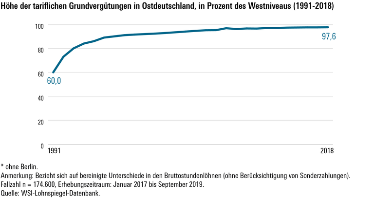 Die geringere Verbreitung von Tarifverträgen ist nach Analyse des WSI neben Unterschieden in der Wirtschaftskraft ein wesentlicher Grund für den Gehaltsrückstand in den neuen Bundesländern. „Bei den Tariflöhnen haben die Gewerkschaften inzwischen eine weitgehende Angleichung zwischen Ost und West durchsetzen können", sagt Dr. Malte Lübker, WSI-Experte für Tarif- und Einkommensanalysen. So lag das Tarifniveau in Ostdeutschland 2018 bei 97,6 Prozent des Westens, verglichen mit 91,9 Prozent im Jahr 2000 (siehe Abbildung 3). „Aber Tarifverträge können nur da wirken, wo sie auch verbindlich angewendet werden", so Lübker. Nach Berechnungen des Instituts für Arbeitsmarkt- und Berufs-forschung (IAB) wurden 2018 nur 45 Prozent der ostdeutschen Beschäftigten nach einem Tarifvertrag bezahlt. Im Westen waren es hingegen 56 Prozent.