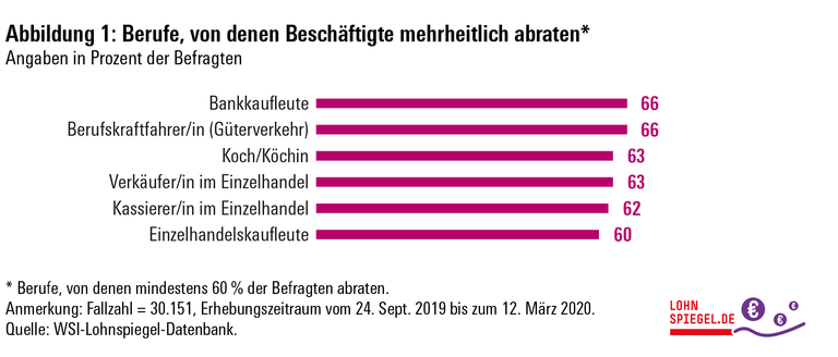 Gut 30.000 Beschäftigte haben diese Frage auf dem Gehaltsportal Lohnspiegel.de beantwortet. Herausgekommen ist eine lange Liste von Berufen, die von den Angehörigen des Berufs weiterempfohlen werden – und eine kurze Liste mit Berufen, von denen die Befragten mehrheitlich abraten. Ganz oben auf der Negativ-Liste stehen Bankkaufleute, die offenbar in der Branche keine Zukunft mehr sehen, sowie die beiden Knochenjobs Berufskraftfahrer/in und Koch/Köchin. Es folgen gleich drei Berufe aus dem Einzelhandel: Verkäufer/in im Einzelhandel, Kassierer/in im Einzelhandel sowie Einzelhandelskaufleute. Lohnspiegel.de wird vom Wirtschafts- und Sozialwissenschaftlichen Institut (WSI) der Hans-Böckler-Stiftung wissenschaftlich betreut.