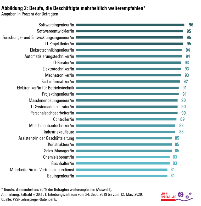 Wer als Berufseinsteiger die Wahl hat, sollte sich gezielt einen tarifgebundenen Arbeitgeber suchen, rät der Fachmann. Oder einen Beruf, der weiter oben auf der Empfehlungsliste steht. Unter den Ausbildungsberufen schneiden zum Beispiel Mechatroniker/in (93 Prozent Weiterempfehlung), Fachinformatiker/in (92 Prozent) und Industriekaufleute (88 Prozent) gut ab. Auch unter Personalsachbearbeitern empfehlen 90 Prozent der Befragten ihren Beruf weiter. Zum Teil noch höhere Zufriedenheit herrscht unter Befragten in verschiedenen Ingenieur- und IT-Berufen, die ein Studium voraussetzen (Abbildung 2).
