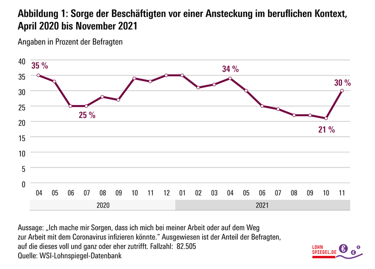 Angesichts von vermehrten Impfdurchbrüchen und dramatisch gestiegenen Fallzahlen nimmt unter Arbeitnehmerinnen und Arbeitnehmern die Sorge vor einer Ansteckung mit dem Coronavirus am Arbeitsplatz wieder zu. Im Verlauf des Novembers gaben 30 Prozent der Befragten an, sich darüber Sorgen zu machen. Dies ist ein deutlicher Anstieg gegenüber den Vormonaten, als dies nur auf etwas mehr als 20 Prozent zutraf.