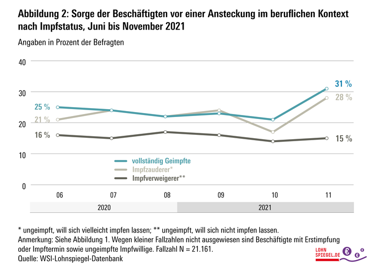 Besonders betroffen sind Beschäftigte in den Verkaufsberufen sowie den Bereichen Gesundheit und Pflege sowie Soziales, Bildung und Erziehung, die am Arbeitsplatz täglich direkten Kontakt zu anderen Menschen haben. Weitgehend unbesorgt ist hingegen eine Gruppe: die Impfverweigerer. Von diesen hatten im November nur 15 Prozent Ansteckungssorgen. Dies ist das Ergebnis einer Umfrage des Portals Lohnspiegel.de, an der sich seit Beginn der Pandemie über 82.500 Beschäftigte beteiligt haben. Lohnspiegel.de wird vom Wirtschafts- und Sozialwissenschaftlichen Institut (WSI) der Hans-Böckler-Stiftung wissenschaftlich betreut.