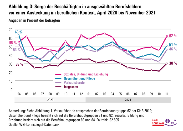 Auch in der 4. Welle der Corona-Pandemie sind Beschäftigte in bestimmten Berufsfeldern besonderen Belastungen ausgesetzt. Hierzu zählen Beschäftigte im Berufsfeld Soziales, Bildung und Erziehung, von denen im November 62 Prozent angaben, sich Sorge vor einer Ansteckung am Arbeitsplatz zu machen (siehe Abbildung 3). Ebenfalls überdurchschnittlich betroffen sind Beschäftigte im Bereich Gesundheit und Pflege (51 Prozent) sowie in den Verkaufsberufen (46 Prozent). Über alle Berufe lag der Anteil der Beschäftigten mit Sorge vor einer Ansteckung in diesem Zeitraum bei 30 Prozent.