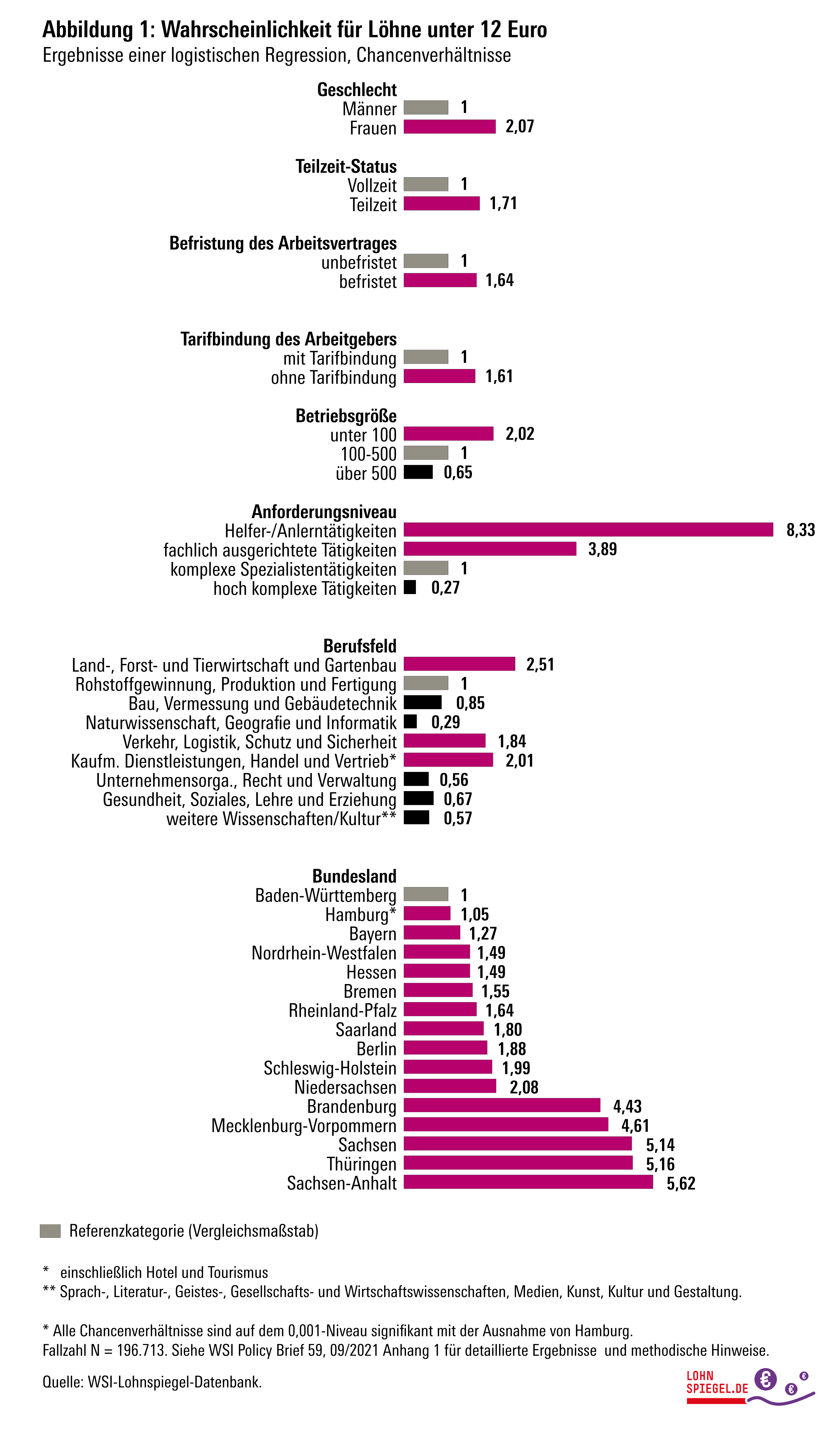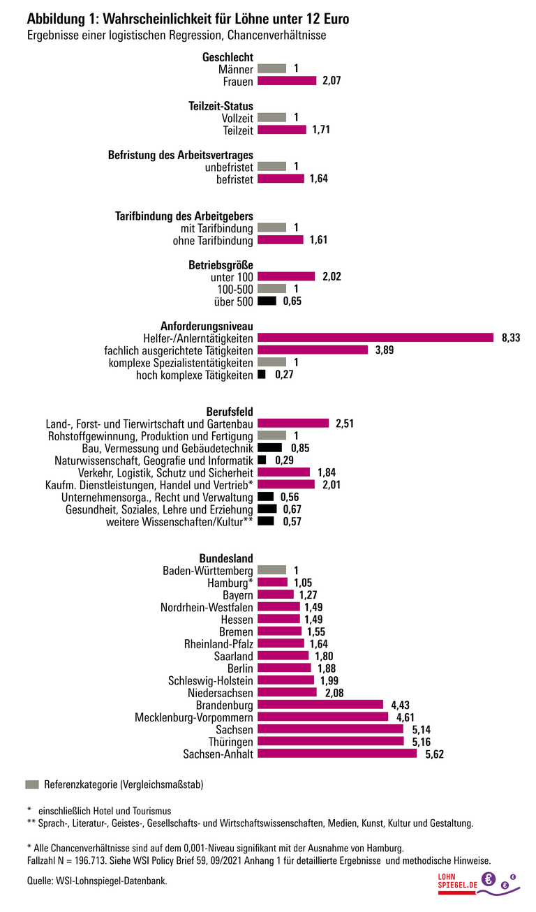 „Niemand ist ganz davor gefeit, im Laufe seines Berufslebens für kurze oder längere Zeit für einen niedrigen Lohn zu arbeiten“, sagt Studienautor Dr. Malte Lübker, Experte für Tarif- und Einkommensanalysen am WSI. „Trotzdem gibt es eine Reihe von Faktoren, die das Risiko für einen Lohn unter 12 Euro deutlich erhöhen.“ Nach den Studienergebnissen sind dies das Geschlecht „weiblich“, eine Tätigkeit in Teilzeit, ein befristeter Arbeitsvertrag, ein Arbeitgeber ohne Tarifbindung, eine Betriebsgröße unter 100 Beschäftigen sowie Helfer- und Anlerntätigkeiten. Nach Bundesland ist das Risiko für niedrige Löhne in Sachsen-Anhalt besonders hoch, gefolgt von den anderen ostdeutschen Flächenländern sowie Niedersachsen und Schleswig-Holstein im Westen (Abbildung 1). „Wenn mehrere dieser Faktoren zusammenkommen, nimmt das Risiko für einen Niedriglohn-Job weiter zu“, so Lübker.